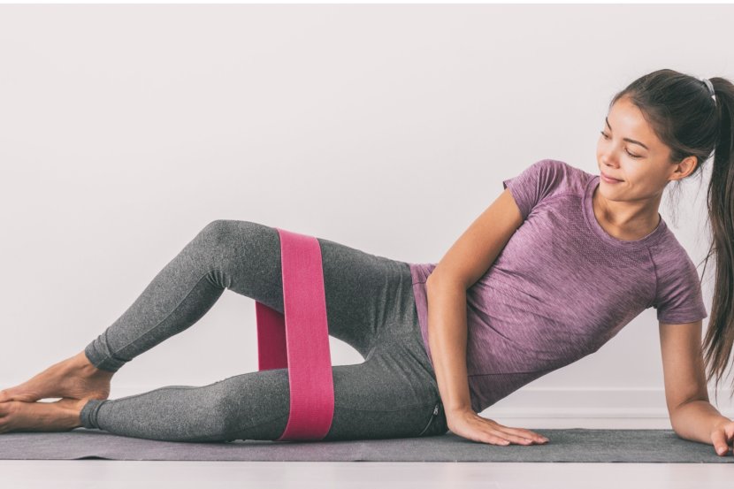 - lezite na bok sa savijenim kolenima i stopalima oslonjenim jedno na drugo, sa elastičnom trakom postavljenom oko butina iznad kolena