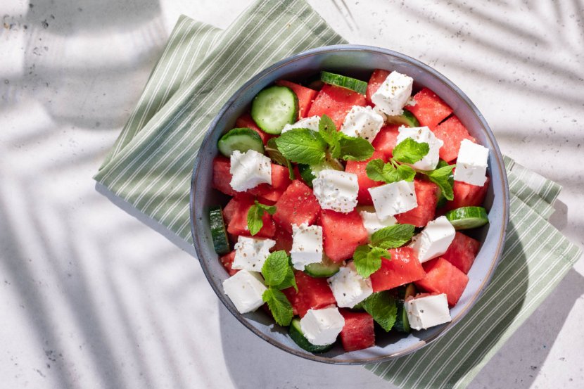 - Pomešajte komade lubenice sa feta sirom, krastavcem i svežom nanom da napravite salatu od lubenice.
